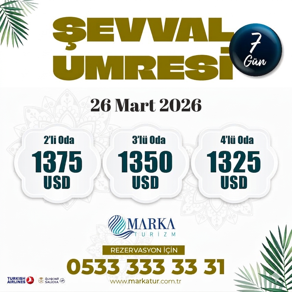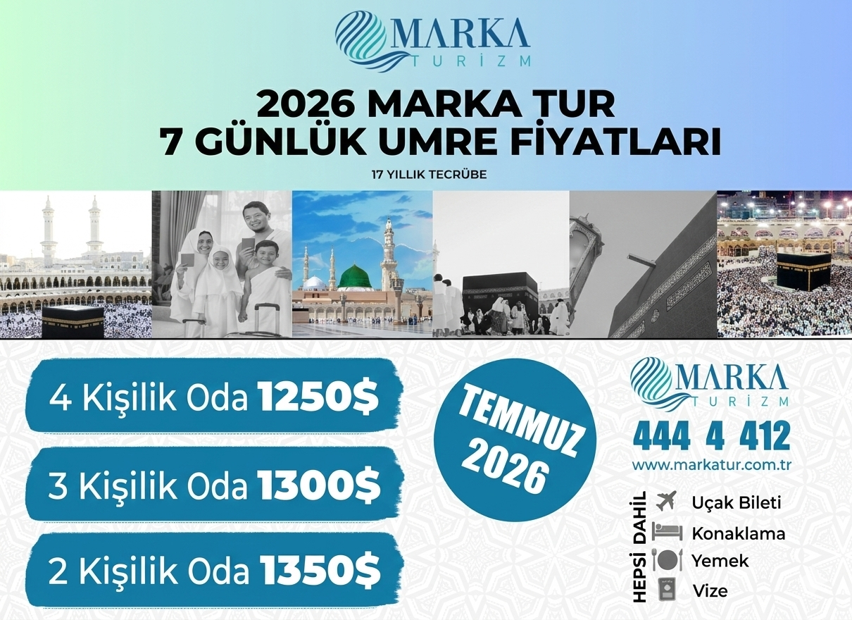 Marka Turizm 7 günlük Umre fiyatlarında ve 7 günlük UMRE turlarında 2026 senesinde çok firmada olmayan bir şıkkı müşterilerine sunmuştur. Her Perşembe günü Umre Turları için uçuş olup 3 gece Medine, 4 gece Mekke seçeneğiyle 7 gece 8 günlük UMREyi müşterilerine 1350 dolardan başlayan fiyatlarla hizmetine sunmuştur. 7 gece 8 günlük Umre Turu çoğunluk itibarıyla vakti müsait olmayan, kısa bir Umre yapmak isteyen Umreciler için hem bir tatil hem bir değişiklik niteliğindedir. Ayrıca, az bir paraya, daha uygun Umre fiyatları seçeneği ile Umre ibadetini yapma imkanı da ortaya çıkmaktadır.